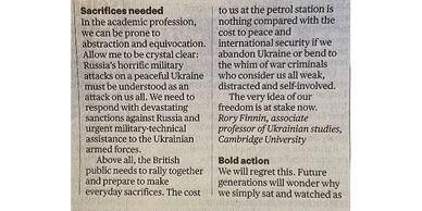 In the Sunday Times on 27 February: 2022: "The British public needs to rally together and prepare to make everyday sacrifices for Ukraine… The very idea of our freedom is at stake now.”